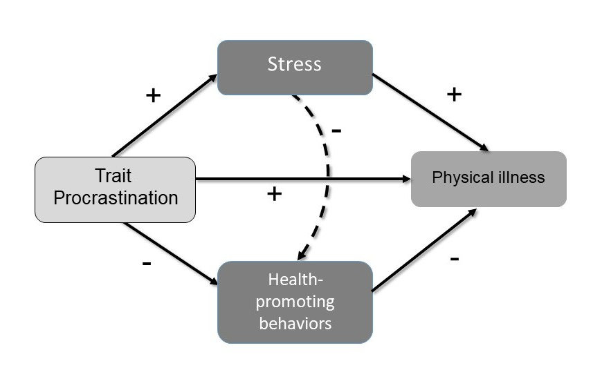 The procrastination-health model (Sirois et al., 2003; Sirois, 2007) is the first model to explicate the links between chronic procrastination and physical health. The model proposes that procrastination confers risk for poor health through both a stress-related route and a behavioral route. However, cross-sectional and longitudinal research suggest that stress is the key pathway linking procrastination to poor health.